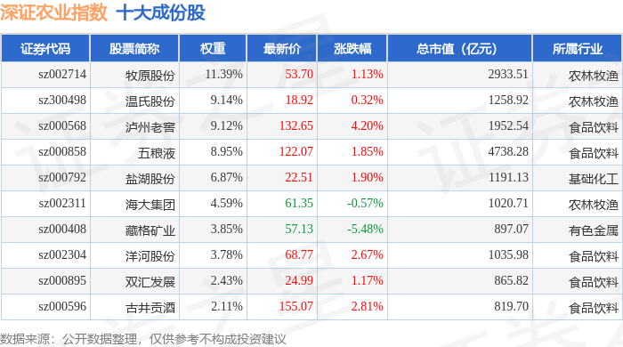 深证农业(399669)指数十大成份股详情如下: