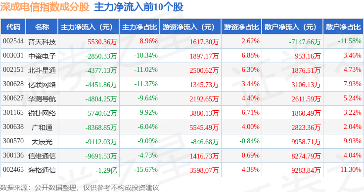 资金流向方面,深成电信(399688)指数成份股当日主力资金净流出合计52.84亿元,游资资金净流入合计17.93亿元,散户资金净流入合计34.91亿元。成份股资金流向详情见下表: