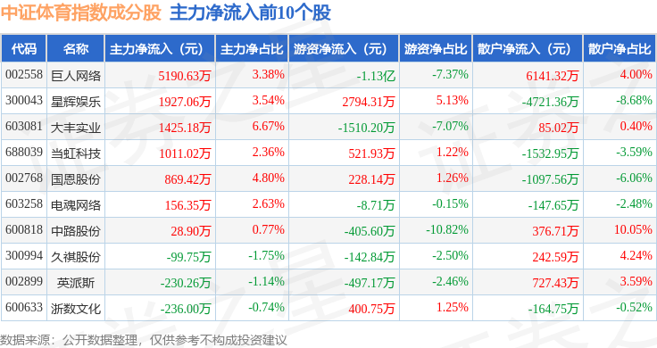 资金流向方面,中证体育(399804)指数成份股当日主力资金净流出合计8.73亿元,游资资金净流入合计2.46亿元,散户资金净流入合计6.28亿元。成份股资金流向详情见下表: