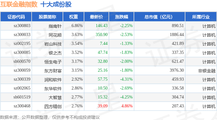 资金流向方面,互联金融(399805)指数成份股当日主力资金净流出合计25.57亿元,游资资金净流入合计7.81亿元,散户资金净流入合计17.77亿元。成份股资金流向详情见下表: