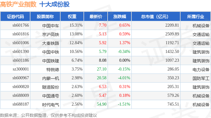资金流向方面,高铁产业(399807)指数成份股当日主力资金净流出合计2.6亿元,游资资金净流入合计9756.39万元,散户资金净流入合计1.62亿元。成份股资金流向详情见下表: