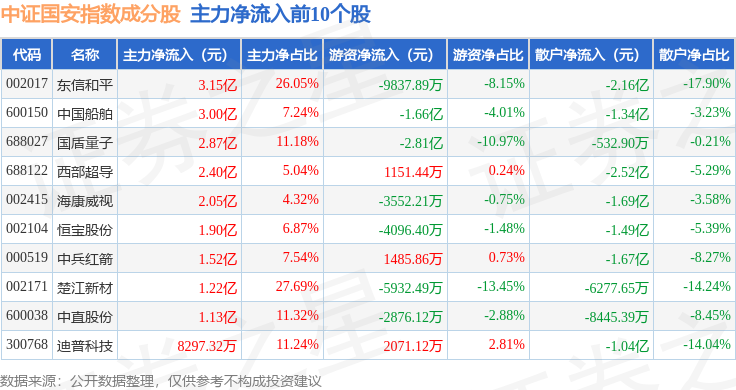 资金流向方面,中证国安(399813)指数成份股当日主力资金净流出合计62.49亿元,游资资金净流入合计24.33亿元,散户资金净流入合计38.16亿元。成份股资金流向详情见下表: