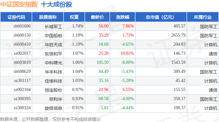 中证国安(399813)指数十大成份股详情如下: