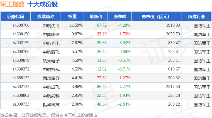 证券之星消息,10月14日,军工指数(399959)报收于1658.3点,跌1.68%,成交284.01亿元,换手率1.87%。当日该指数成份股中,上涨的有6家,中直股份以3.55%的涨幅领涨,下跌的有33家,华秦科技以6.0%的跌幅领跌。