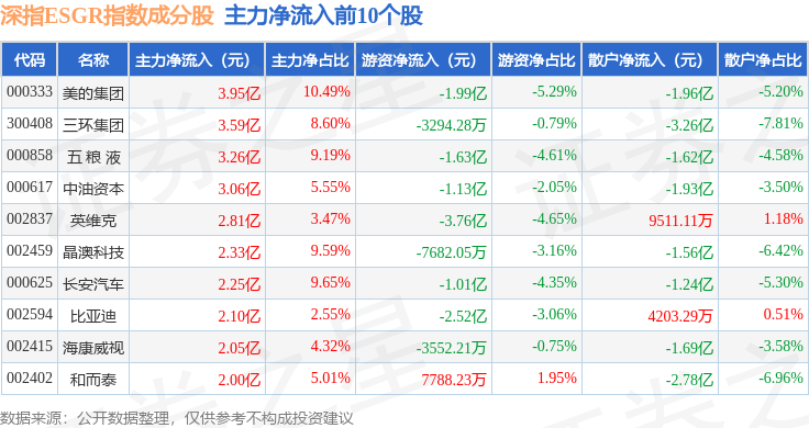 资金流向方面,深指ESGR(470026)指数成份股当日主力资金净流出合计347.44亿元,游资资金净流入合计96.35亿元,散户资金净流入合计251.09亿元。成份股资金流向详情见下表:
