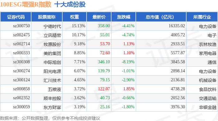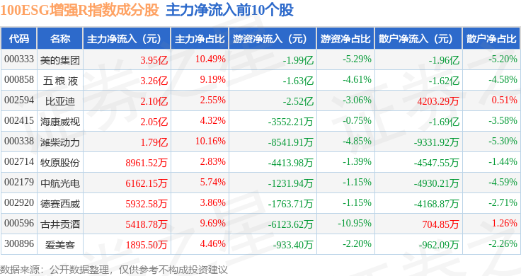资金流向方面,100ESG增强R(470033)指数成份股当日主力资金净流出合计92.88亿元,游资资金净流入合计14.12亿元,散户资金净流入合计78.76亿元。成份股资金流向详情见下表: