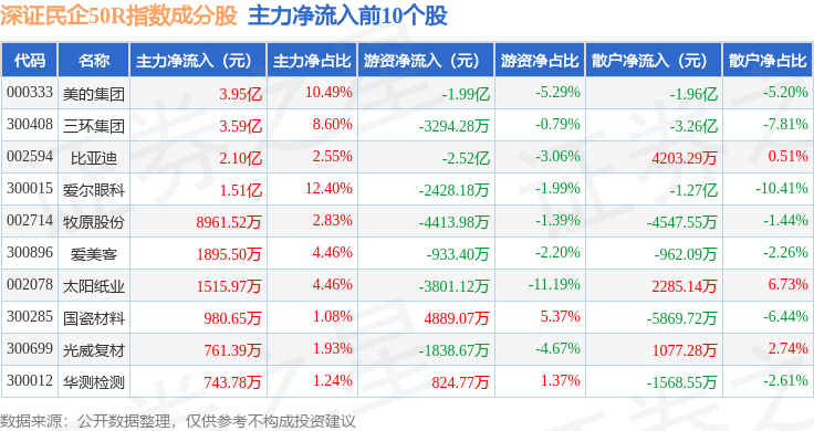 资金流向方面,深证民企50R(470057)指数成份股当日主力资金净流出合计147.92亿元,游资资金净流入合计39.4亿元,散户资金净流入合计108.52亿元。成份股资金流向详情见下表: