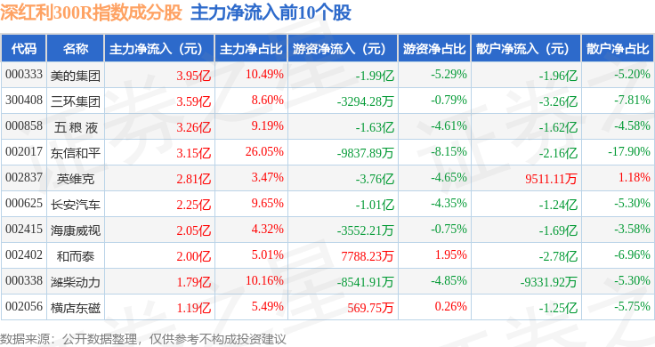 资金流向方面,深红利300R(470062)指数成份股当日主力资金净流出合计107.31亿元,游资资金净流入合计14.13亿元,散户资金净流入合计93.17亿元。成份股资金流向详情见下表: