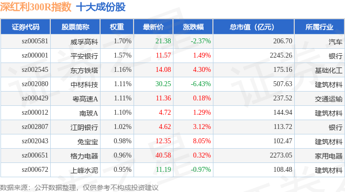 证券之星消息,10月14日,深红利300R(470062)指数报收于7999.36点,跌0.77%,成交2704.32亿元,换手率2.62%。当日该指数成份股中,上涨的有100家,英科医疗以12.69%的涨幅领涨,下跌的有195家,电连技术以9.17%的跌幅领跌。