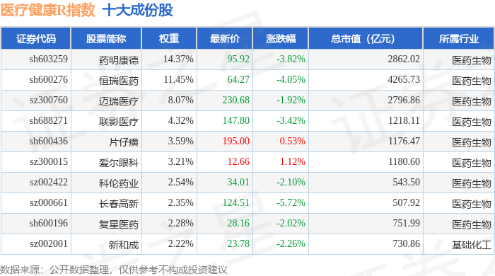 资金流向方面,医疗健康R(480016)指数成份股当日主力资金净流出合计26.89亿元,游资资金净流入合计6.54亿元,散户资金净流入合计20.35亿元。成份股资金流向详情见下表: