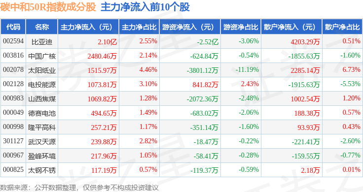资金流向方面,碳中和50R(480021)指数成份股当日主力资金净流出合计48.81亿元,游资资金净流入合计9.4亿元,散户资金净流入合计39.41亿元。成份股资金流向详情见下表: