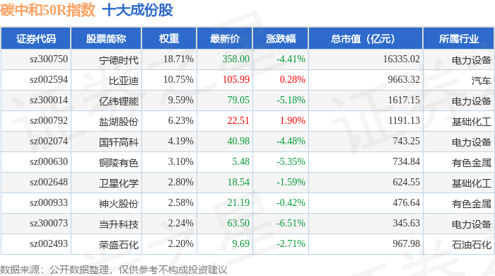 证券之星消息,10月14日,碳中和50R(480021)指数报收于2427.58点,跌2.37%,成交728.41亿元,换手率1.91%。当日该指数成份股中,上涨的有13家,甘肃能源以3.44%的涨幅领涨,下跌的有37家,新宙邦以7.37%的跌幅领跌。