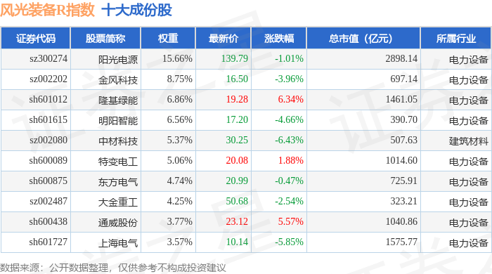 证券之星消息,10月14日,风光装备R(480026)指数报收于1871.22点,跌1.0%,成交787.7亿元,换手率4.78%。当日该指数成份股中,上涨的有12家,天合光能以8.39%的涨幅领涨,下跌的有18家,中材科技以6.43%的跌幅领跌。