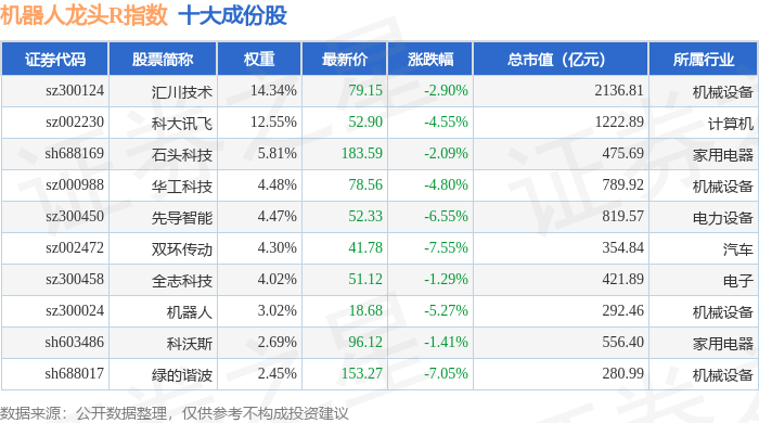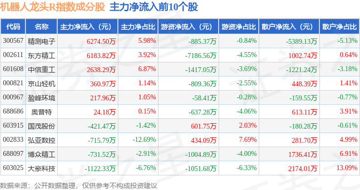 资金流向方面,机器人龙头R(480071)指数成份股当日主力资金净流出合计45.9亿元,游资资金净流入合计10.53亿元,散户资金净流入合计35.38亿元。成份股资金流向详情见下表: