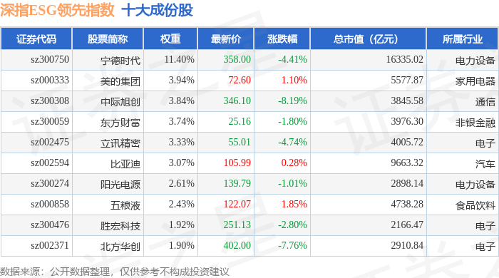 资金流向方面,深指ESG领先(970029)指数成份股当日主力资金净流出合计229.62亿元,游资资金净流入合计59.41亿元,散户资金净流入合计170.21亿元。成份股资金流向详情见下表: