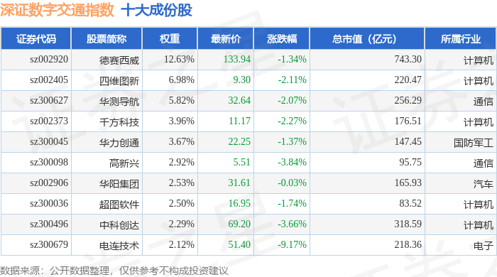 证券之星消息,10月14日,深证数字交通(970049)指数报收于4307.26点,跌2.26%,成交239.41亿元,换手率2.92%。当日该指数成份股中,上涨的有5家,光庭信息以4.5%的涨幅领涨,下跌的有45家,电连技术以9.17%的跌幅领跌。