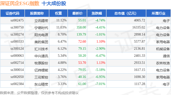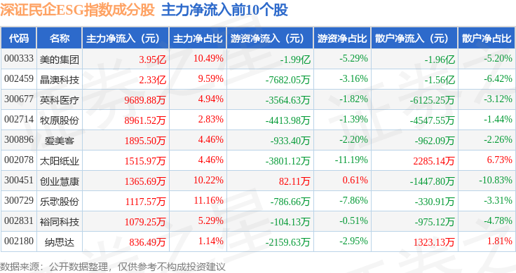 资金流向方面,深证民企ESG(970056)指数成份股当日主力资金净流出合计109.84亿元,游资资金净流入合计20.62亿元,散户资金净流入合计89.22亿元。成份股资金流向详情见下表: