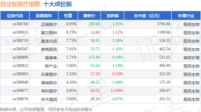 证券之星消息,10月14日,创业板医疗(970082)指数报收于3872.41点,跌0.69%,成交149.95亿元,换手率1.9%。当日该指数成份股中,上涨的有7家,英科医疗以12.69%的涨幅领涨,下跌的有42家,康龙化成以5.38%的跌幅领跌。