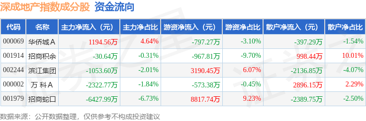 资金流向方面,深成地产(971001)指数成份股当日主力资金净流出合计8640.44万元,游资资金净流入合计9669.73万元,散户资金净流出合计1029.29万元。成份股资金流向详情见下表: