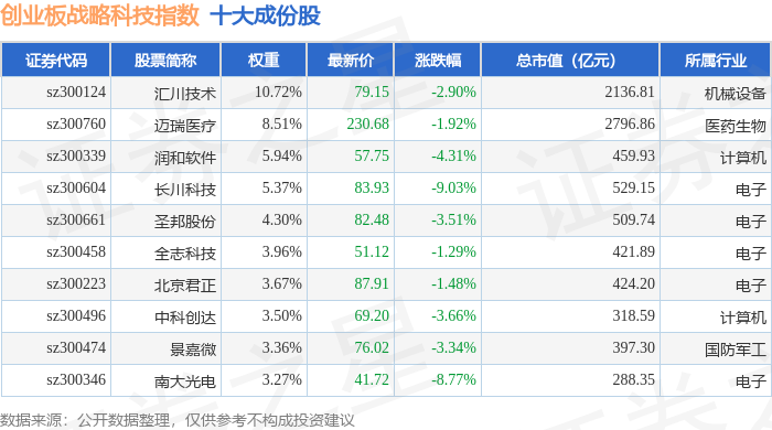 证券之星消息,10月14日,创业板战略科技(971004)指数报收于6514.48点,跌3.32%,成交573.2亿元,换手率4.82%。当日该指数成份股中,上涨的有11家,我武生物以4.79%的涨幅领涨,下跌的有39家,贝达药业以10.63%的跌幅领跌。