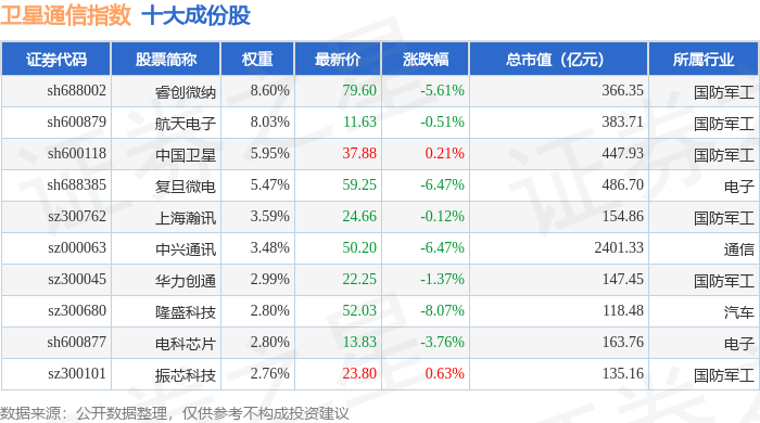 证券之星消息,10月14日,卫星通信(980018)指数报收于3684.83点,跌2.62%,成交544.03亿元,换手率1.35%。当日该指数成份股中,上涨的有8家,奥普光电以5.96%的涨幅领涨,下跌的有42家,隆盛科技以8.07%的跌幅领跌。