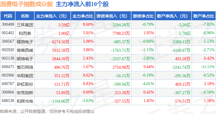 资金流向方面,消费电子(980030)指数成份股当日主力资金净流出合计97.24亿元,游资资金净流入合计28.23亿元,散户资金净流入合计69.01亿元。成份股资金流向详情见下表: