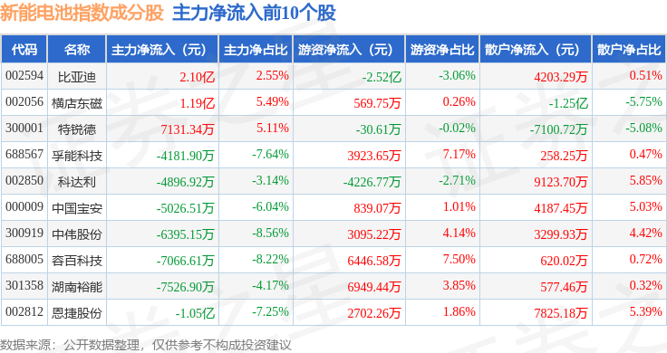资金流向方面,新能电池(980032)指数成份股当日主力资金净流出合计101.29亿元,游资资金净流入合计23.02亿元,散户资金净流入合计78.28亿元。成份股资金流向详情见下表: