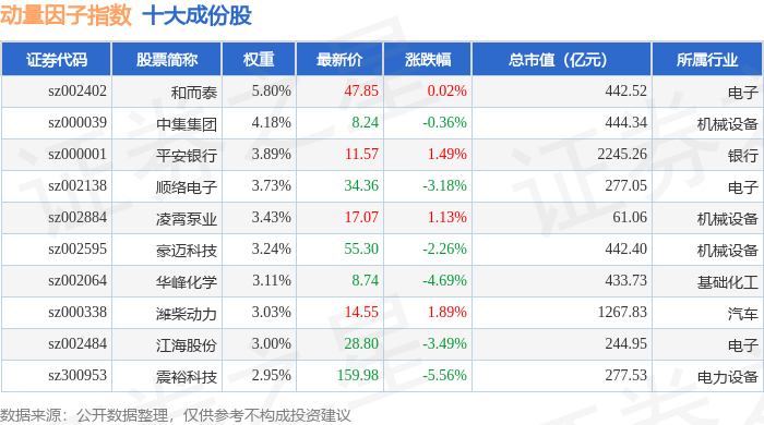 证券之星消息,10月14日,动量因子(980057)指数报收于2257.87点,跌1.9%,成交555.99亿元,换手率2.61%。当日该指数成份股中,上涨的有11家,旺能环境以2.51%的涨幅领涨,下跌的有39家,双环传动以7.55%的跌幅领跌。