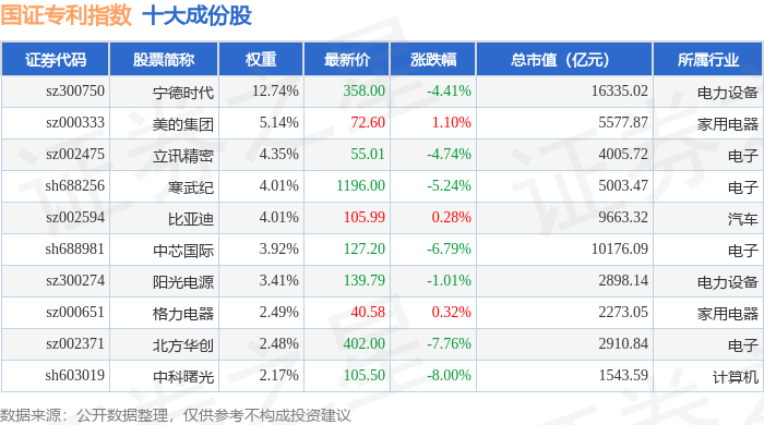 证券之星消息,10月14日,国证专利(980070)指数报收于3607.94点,跌2.57%,成交2927.85亿元,换手率1.94%。当日该指数成份股中,上涨的有25家,隆基绿能以6.34%的涨幅领涨,下跌的有74家,芯原股份以9.79%的跌幅领跌。
