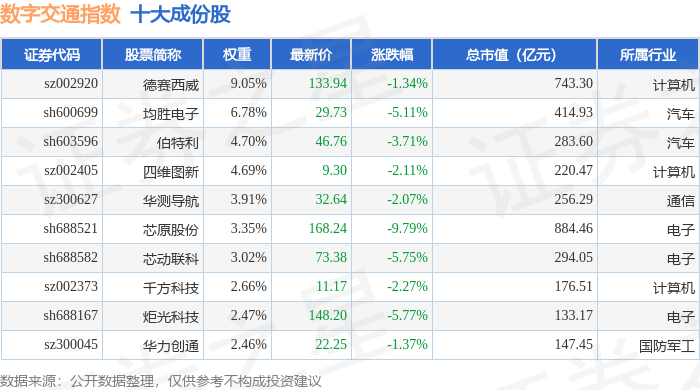 证券之星消息,10月14日,数字交通(980075)指数报收于3253.62点,跌3.3%,成交373.49亿元,换手率2.45%。当日该指数成份股中,上涨的有4家,振芯科技以0.63%的涨幅领涨,下跌的有46家,芯原股份以9.79%的跌幅领跌。
