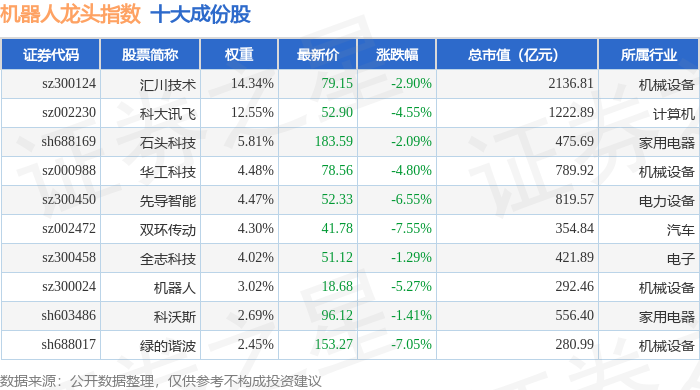 机器人龙头(980071)指数十大成份股详情如下: