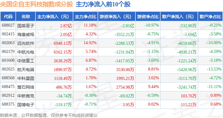 资金流向方面,央国企自主科技(980083)指数成份股当日主力资金净流出合计106.94亿元,游资资金净流入合计65.49亿元,散户资金净流入合计41.45亿元。成份股资金流向详情见下表:
