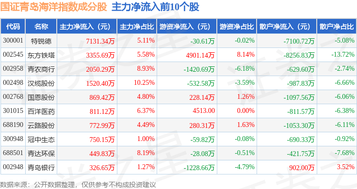 资金流向方面,国证青岛海洋(980532)指数成份股当日主力资金净流出合计1696.94万元,游资资金净流入合计7402.99万元,散户资金净流出合计5706.05万元。成份股资金流向详情见下表: