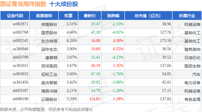 国证青岛海洋(980532)指数十大成份股详情如下: