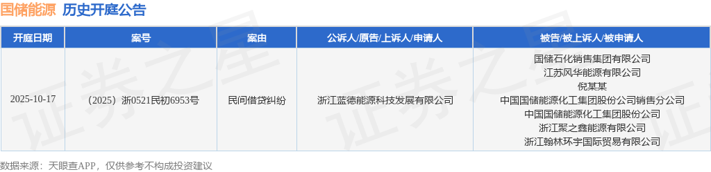 证券之星消息,根据天眼查APP显示,近日公布了一则中国国储能源化工集团股份公司作为被告/被上诉人的开庭公告,详细内容如下: