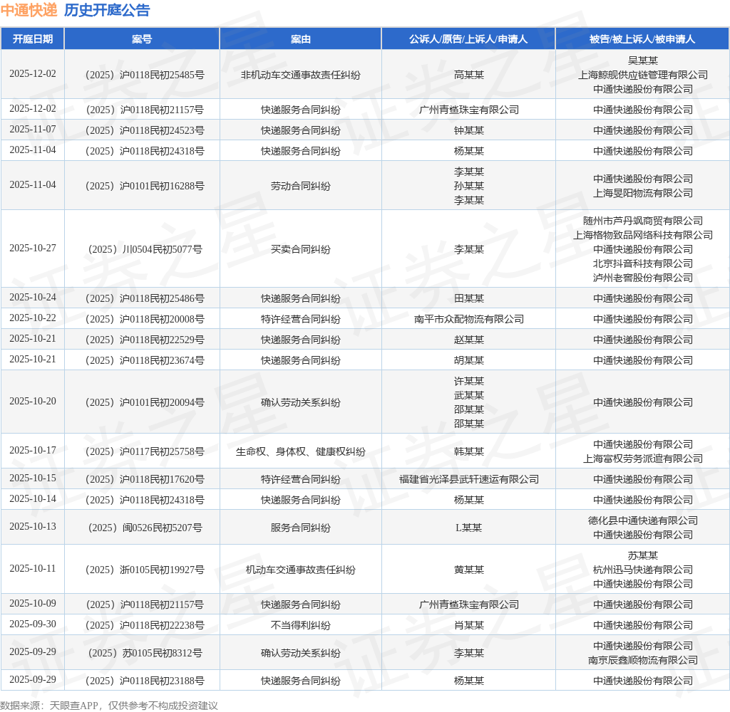 案号:(2025)沪0117民初25758号根据统计,近一年内以中通快递股份有限公司为当事人的历史开庭公告有143则,其中案由为“快递服务合同纠纷”的公告以45则居首,其次为“特许经营合同纠纷”有15则,“非机动车交通事故责任纠纷”有9则。历史开庭公告(前20条)如下: