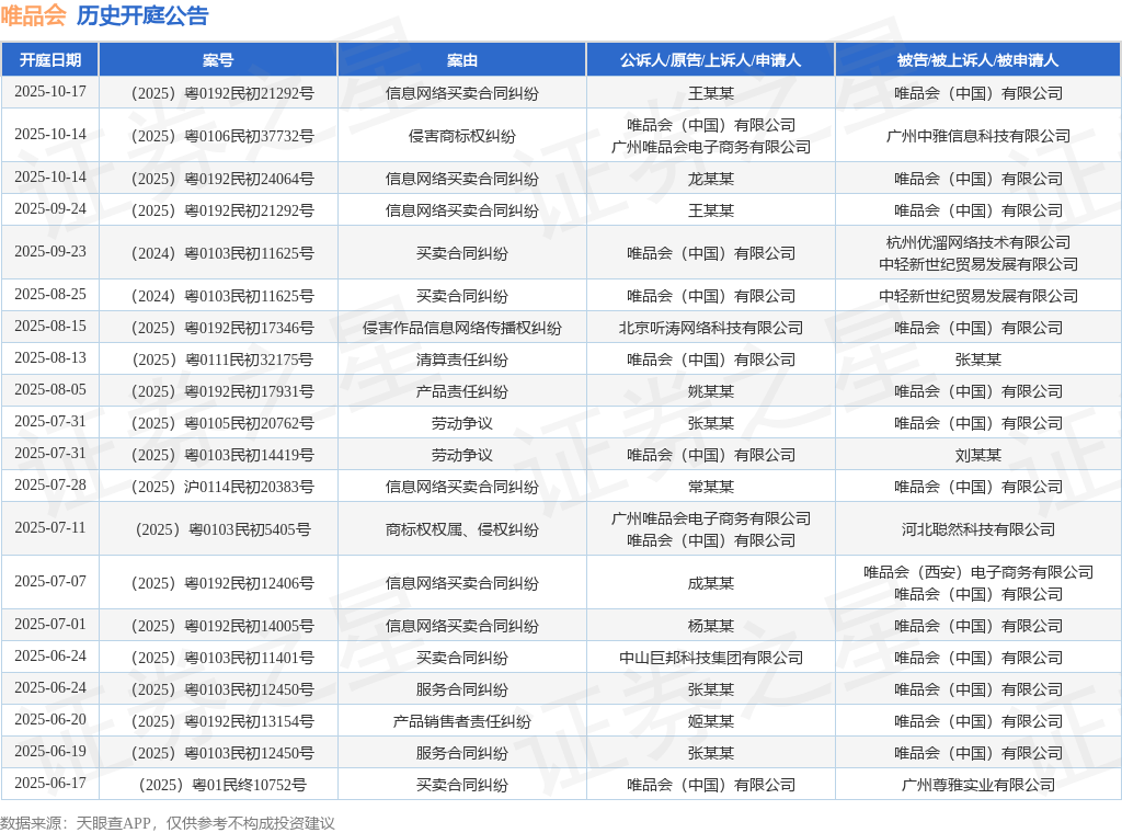 案号:(2025)粤0192民初21292号根据统计,近一年内以唯品会(中国)有限公司为当事人的历史开庭公告有91则,其中案由为“买卖合同纠纷”的公告以27则居首,其次为“侵害商标权纠纷”有16则,“信息网络买卖合同纠纷”有12则。历史开庭公告(前20条)如下: