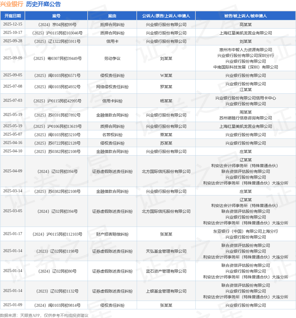 案号:(2025)沪0115民初103046号根据统计,近一年内以兴业银行股份有限公司为当事人的历史开庭公告有33则,其中案由为“名誉权纠纷”的公告以5则居首,其次为“证券虚假陈述责任纠纷”有5则,“金融借款合同纠纷”有5则。历史开庭公告(前20条)如下: