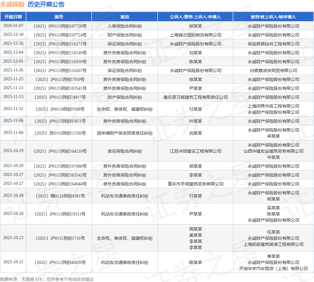 案号:(2025)沪0115民初116947号根据统计,近一年内以永诚财产保险股份有限公司为当事人的历史开庭公告有263则,其中案由为“意外伤害保险合同纠纷”的公告以117则居首,其次为“人身保险合同纠纷”有28则,“机动车交通事故责任纠纷”有27则。历史开庭公告(前20条)如下: