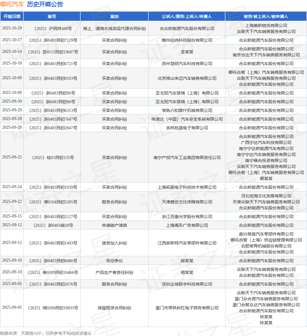案号:(2025)浙0483民初7129号根据统计,近一年内以合众新能源汽车股份有限公司为当事人的历史开庭公告有378则,其中案由为“买卖合同纠纷”的公告以149则居首,其次为“服务合同纠纷”有50则,“合同纠纷”有47则。历史开庭公告(前20条)如下: