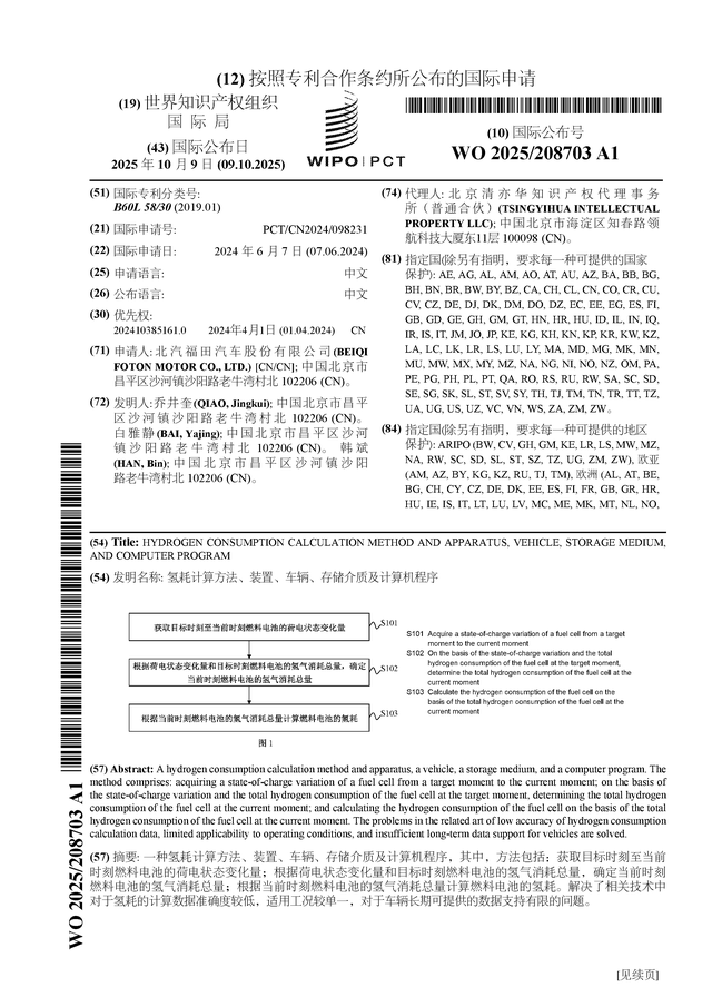 证券之星消息,根据企查查数据显示福田汽车(600166)公布了一项国际专利申请,专利名为“氢耗计算方法、装置、车辆、存储介质及计算机程序”,专利申请号为PCT/CN2024/098231,国际公布日为2025年10月9日。