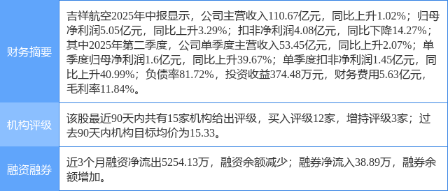 2025年8月24日,国金证券研究员郑树明,王凯婕发布了对吉祥航空的研报《非经收益增加,H1净利润同比增长》,该研报对吉祥航空给出“买入”评级。证券之星数据中心根据近三年发布的研报数据计算,该研报作者对此股的盈利预测准确度为37.31%。