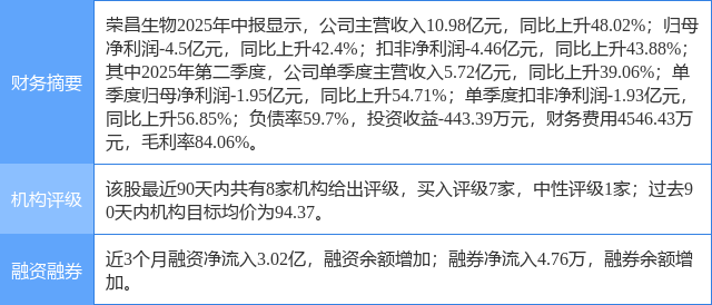 2025年8月29日,东海证券研究员杜永宏,付婷发布了对荣昌生物的研报《公司简评报告:业绩持续向好,出海进展加速》,该研报对荣昌生物给出“买入”评级。研报中预计公司2025-2027年实现营业收入23.89/31.74/41.27亿元,归属于母公司净利润-8.75/-3.27/0.89亿元(2025-2026年原预测为-9.87/-3.56亿元),维持“买入”评级。证券之星数据中心根据近三年发布的研报数据计算,该研报作者对此股的盈利预测准确度为53.91%。