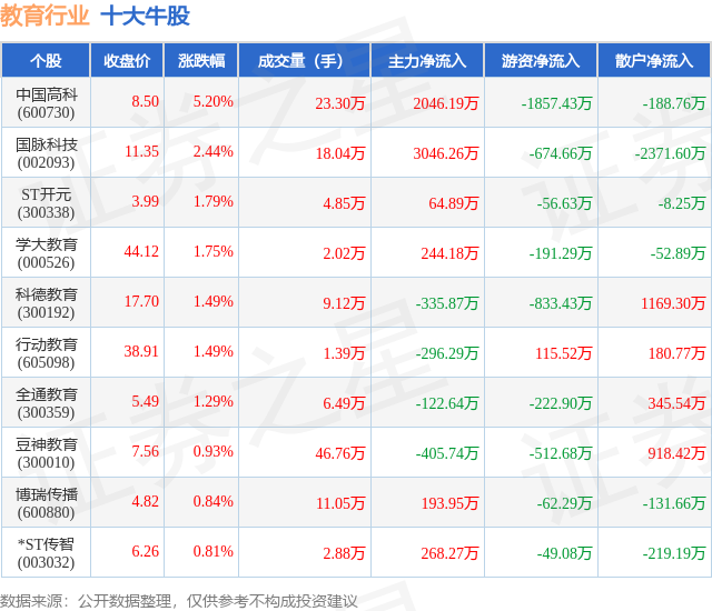 个股表现方面,教育行业当日领涨股为中国高科(600730),该股当日报收8.5,上涨5.2%,成交量23.3万,主力资金净流入2046.19万元。国脉科技(002093)以上涨2.44%紧随其后,该股当日成交量18.04万,主力资金净流入3046.26万元。除此之外,ST开元(300338)、学大教育(000526)、科德教育(300192)均进入当日牛股之列。具体个股列表见下表: