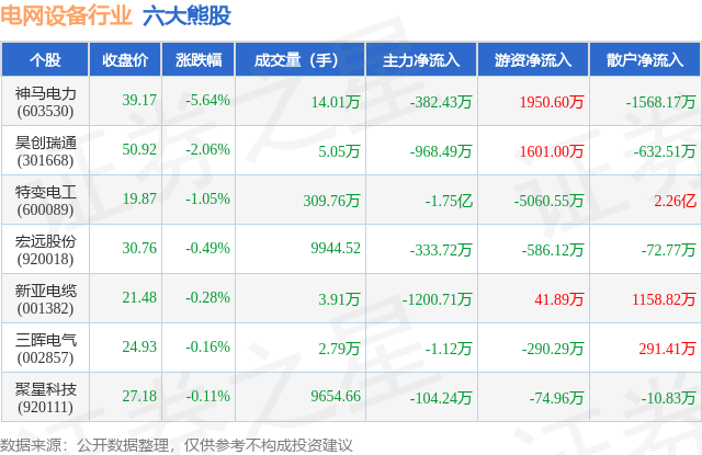 个股表现方面,电网设备行业当日领跌股为神马电力(603530),该股当日报收39.17,下跌5.64%,成交量14.01万,主力资金净流出382.43万元。昊创瑞通(301668)以下跌2.06%紧随其后,该股当日成交量5.05万,主力资金净流出968.49万元。除此之外,特变电工(600089)、宏远股份(920018)、新亚电缆(001382)均进入当日熊股之列。具体个股列表见下表: