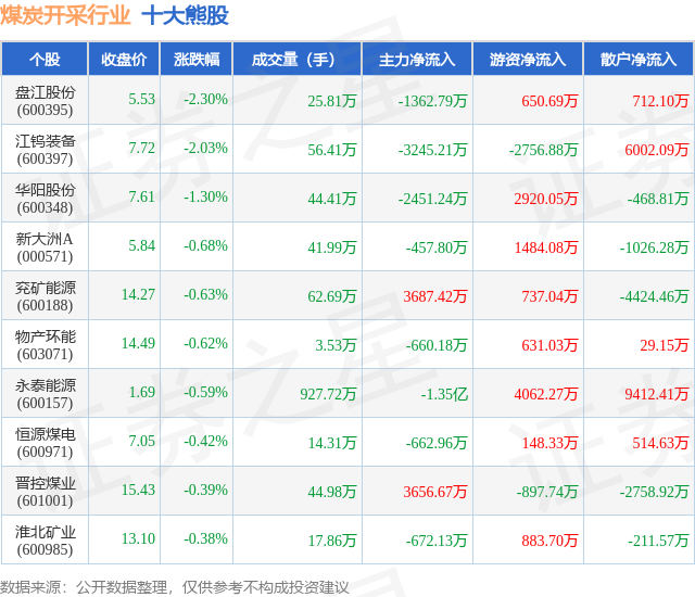 个股表现方面,煤炭开采行业当日领跌股为盘江股份(600395),该股当日报收5.53,下跌2.3%,成交量25.81万,主力资金净流出1362.79万元。江钨装备(600397)以下跌2.03%紧随其后,该股当日成交量56.41万,主力资金净流出3245.21万元。除此之外,华阳股份(600348)、新大洲A(000571)、兖矿能源(600188)均进入当日熊股之列。具体个股列表见下表: