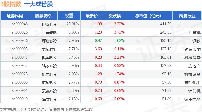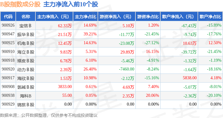 资金流向方面,B股指数(000003)成份股当日主力资金净流入合计40.43万元,游资资金净流出合计39.52万元,散户资金净流出合计0.92万元。成份股资金流向详情见下表: