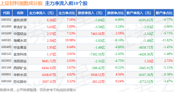 资金流向方面,上证材料(000033)指数成份股当日主力资金净流出合计20.55亿元,游资资金净流出合计3.74亿元,散户资金净流入合计24.3亿元。成份股资金流向详情见下表: