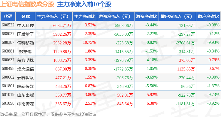 资金流向方面,上证电信(000040)指数成份股当日主力资金净流出合计2.97亿元,游资资金净流入合计1.79亿元,散户资金净流入合计1.19亿元。成份股资金流向详情见下表: