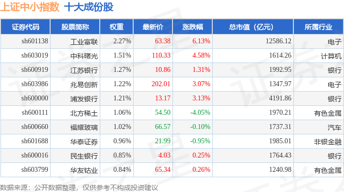 证券之星消息,10月15日,上证中小(000046)指数报收于5186.65点,涨1.18%,成交4218.45亿元,换手率1.57%。当日该指数成份股中,上涨的有328家,金盘科技以20.0%的涨幅领涨,下跌的有102家,长城军工以7.36%的跌幅领跌。